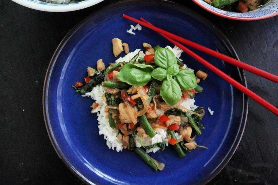 Authentic Thai basil chicken, not surprisingly, calls for Thai basil, a variety that has a slightly spicy, anise-like flavor. I substituted Italian basil because that’s what’s growing in my garden. It was still delicious.