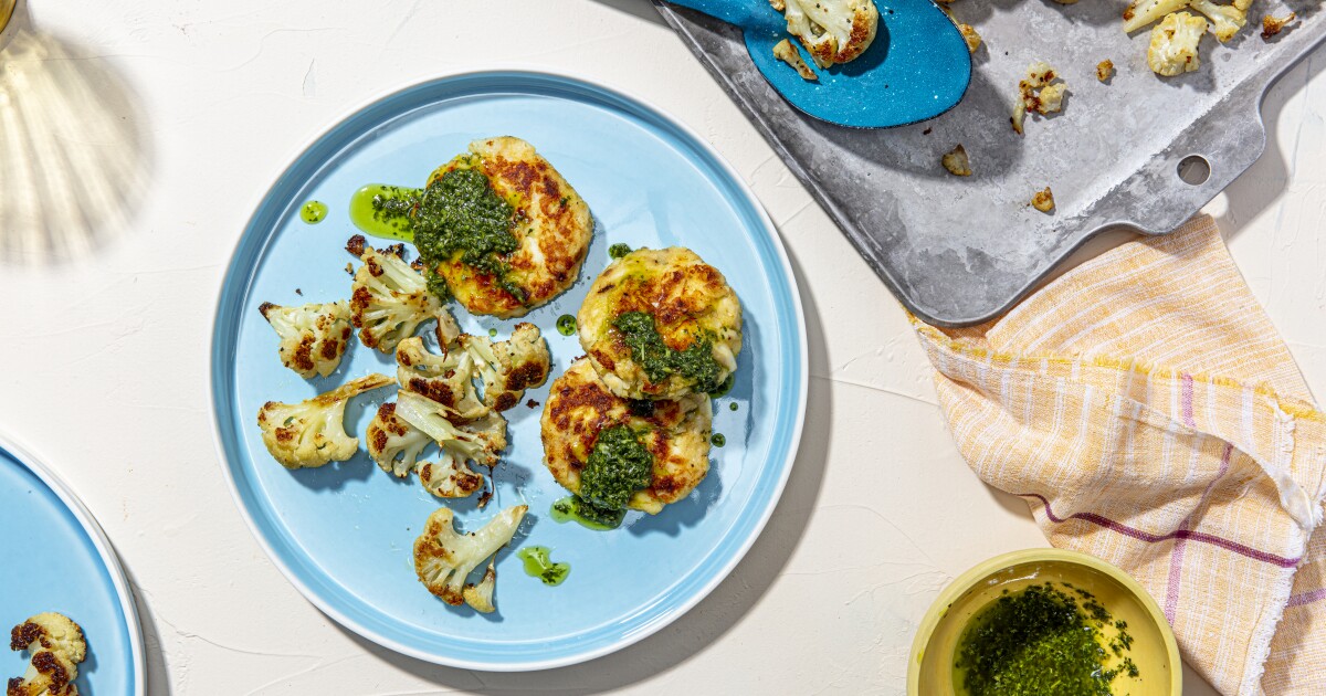 Any straggling herbs are blended with vinegar and oil into a bright herb sauce for pan-fried fish cakes and roast cauliflower.