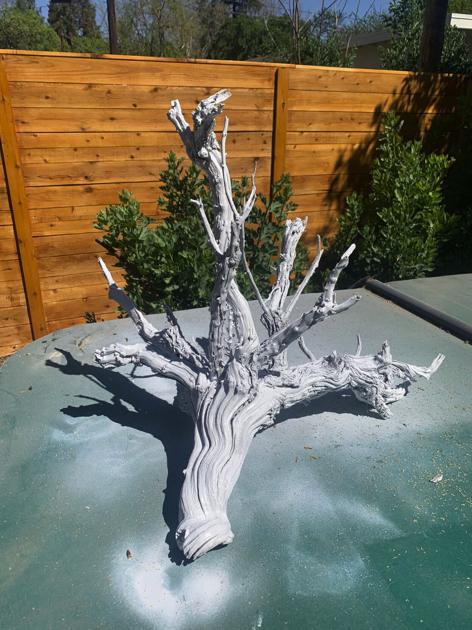 I put it on the old green plastic cover on top of the Jacuzzi, the cover headed for the dump, bought a can of white spray paint and gave it a coat. The twisty brown wood turned white. The next day, after a second coat, whiter still. I can’t stop.